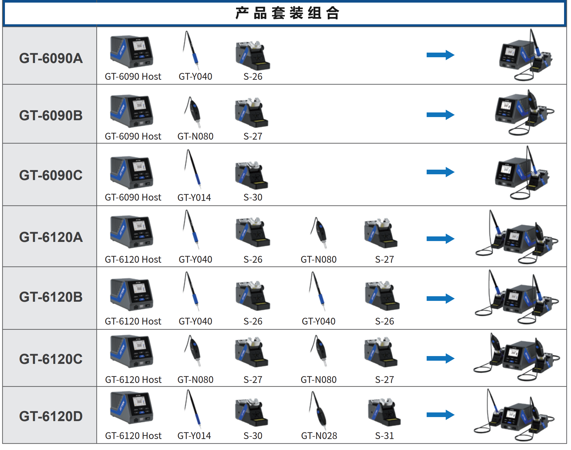 GT-6090主机1台,GT烙铁手柄1支,烙铁座1个,烙铁座连接线1条,接地线1条,USB2.0数据线1条,电源线1条,说明书:1 本, 合格证1张。