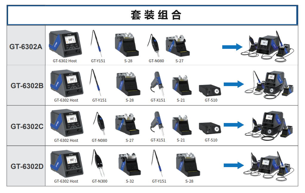 GT-6302主机1台,GT烙铁手柄2支,烙铁座2个,烙铁座连接线2条,接地线1条,电源线1条,说明书:1 本, 合格证1张。